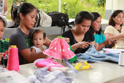 Darlene Pridmore, Pastor Charlie Pridmore’s wife, trained victims of typhoon Yolanda to knit baby clothes. They are now selling their products in malls in Tacloban City.
